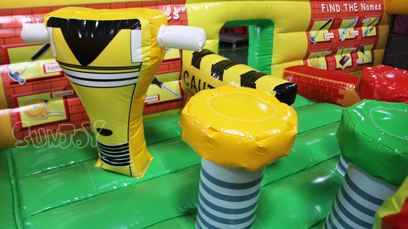This little builder inflatable amusement park is made of high quality commercial 15oz PVC tarpaulin, with full digital printing. Inside the large playground, there are a lot of construction tool obstacles, a small ball pit and a small slide. You can also see a big inflatable hammer and spanner on the pillars. Tall colorful inflatable walls with strong safety mesh. This commercial inflatable playground is great for your party rental business and indoor play center.