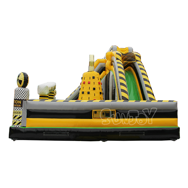 This nuclear meltdown theme amusement park is a combination of various thrilling games, large bouncing playground with a round inflatable rock climbing wall, giant inflatable climb and slide with a tall jump off cliff platform, and other small obstacles. Full digital printing for decoration ,very eye-catching and enjoyable for children and teens. Made of top quality 15oz PVC tarpaulin, durable and portable for party rental business and other commercial uses.