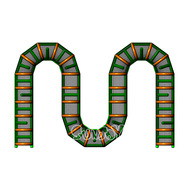 This sinuate inflatable track is designed for zorb ball racing or obstacle running. The arched tunnel size is about 1.8 meter width and 1.7 meter height, can be customized according to your needs. Covered with strong shade netting. This M-shaped long obstacle tunnel is very fun for kids. The curved shape and totally length can also be customized depending on your venue. Built from commercial grade 15oz PVC tarpaulin material, air tight or air constant structure.