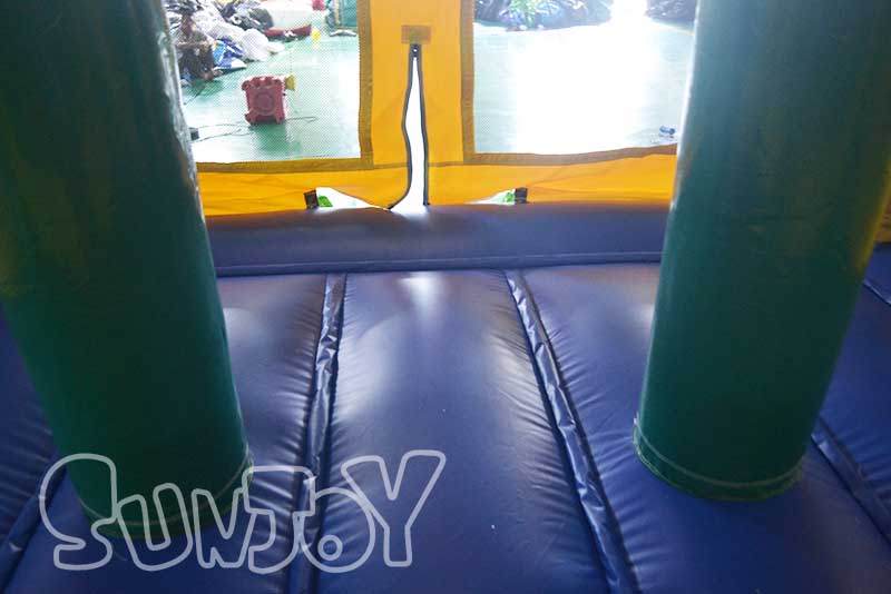 This palm tree theme inflatable moonwalk is designed for children. The total bounce house looks like a green jungle, and includes the fun obstacle pillars and basketball hoop. Kids can have fun withf friends at the backyard parties, fairs, carnivals and so on. You can customize the logo printing and card holder on the bouncy house. It's very profitable for your inflatable rental business.