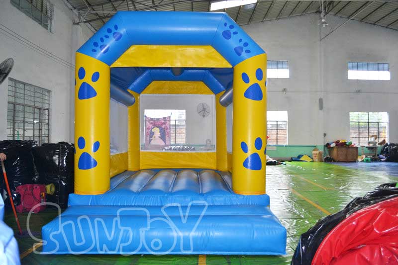 Join in the fun with our cat footprints inflatable bouncer, it's very simple to play for little kids and keep you child entertained all day long. This moonwalk bouncer is designed with blue and yellow bright colors, and the cute cat footprints patterns printing. With strong mesh sides allow you to keep an eye on your kids. Extremely safe and fun for children at the birthday parties, outdoor activities and fun social events.