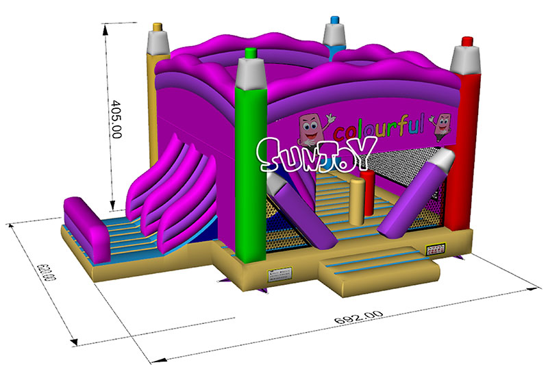 This colorful crayon bounce house combo is a very creative design, four big color pens as the pillars, two small color pens as the entrance, cute customized cartoon printing on the front banner. Inside the bounce house, small obstacles and a double lane slide to add extreme fun for children. Under the small dry slide, there is a round tunnel, additional enjoyment to play in this inflatable unit. Made of commercial PVC and strong mesh materials, suitable for rental business and backyard daily use.