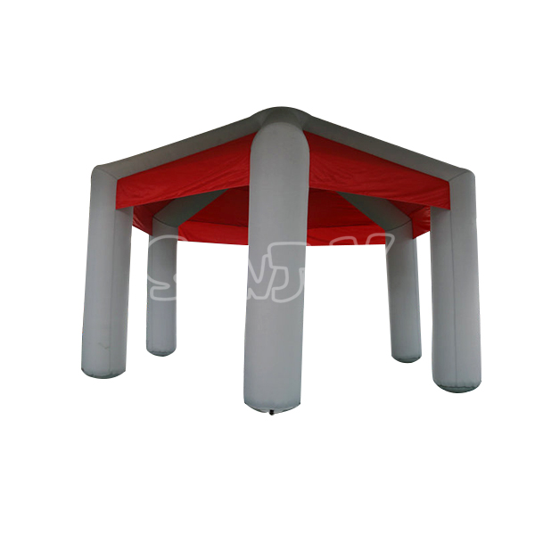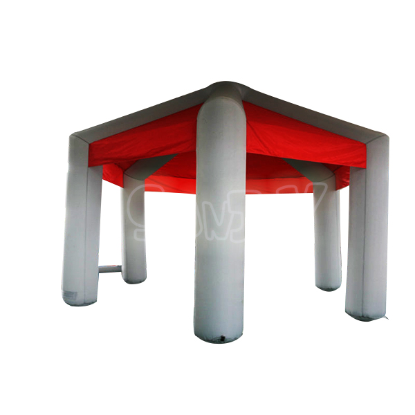 This advertising tent is air constant design, shaped by a blower. Six gray color inflatable columns with red color awning trampoline. Can be customized with your business banner and company logo on the outside surface. This durable and portable inflatable tent is very suitable for outdoor activities, like promotion, trade show, carnival, fair, etc. The material is 210D oxford fabric, feature with 10 strong anchoring D-rings.
