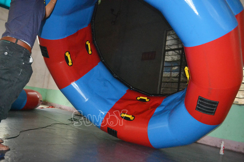 This trampoline is a double-layer design, just like two inflatable tubes stacked together. The bouncing surface is a black elastic net, can be changed to a trampoline fabric. There are total 16 handles, 12 inside and 4 outside. The trampoline seams are covered with PVC sheet. Four Velcro blocks on the top and bottom tubes. Inflatable tubes made of top quality 0.9mm PVC tarpaulin. You can roll inside this inflatable wheel or jump on the surface to have fun on water or land.
