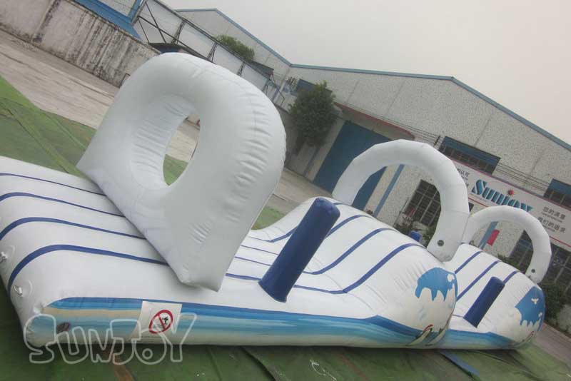 This water obstacle course is designed with the penguin slides theme, featured with a crawl through hole obstacle, one small slide and one big slide with arches, and four pillars. Players can crawl through the first hole, and then challenge the slippery slides one by one, at the last straightly slide into the water. How fun is that in the hot summer! Made of top quality 0.9mm PVC tarpaulin, digital printing on the surface with free logo banner, very suitable for your commercial water parks or swimming pool.