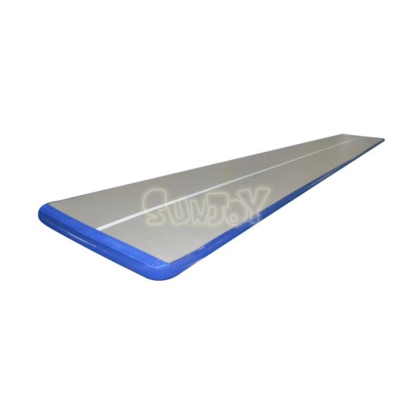 This inflatable gymnastics air track is 12 meters long and gray color, made of top quality DWF155 and 0.9mm PVC tarpaulin materials, 2 air valves without handle. High quality blue color Velcro strap on both ends of the gym mat. It can be used for gymnastics training, outdoor sports, yoga class, and so on. Total air sealed structure, very portable for outdoor use.