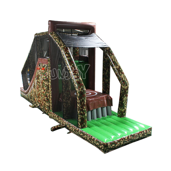This is 2-in-1 interactive game for both kids and adults, a tall platform with a climbing stair, when you climb up to the top you can take a step forward to jump off this cliff and landing on the inflatable air bag, if you don't dare, you can turn back to slide down this high mountain. This play structure is made of commercial grade 15oz PVC tarpaulin and strong safety netting materials, very durable and safe. Main color is military camouflage color, can be customized according to your needs.